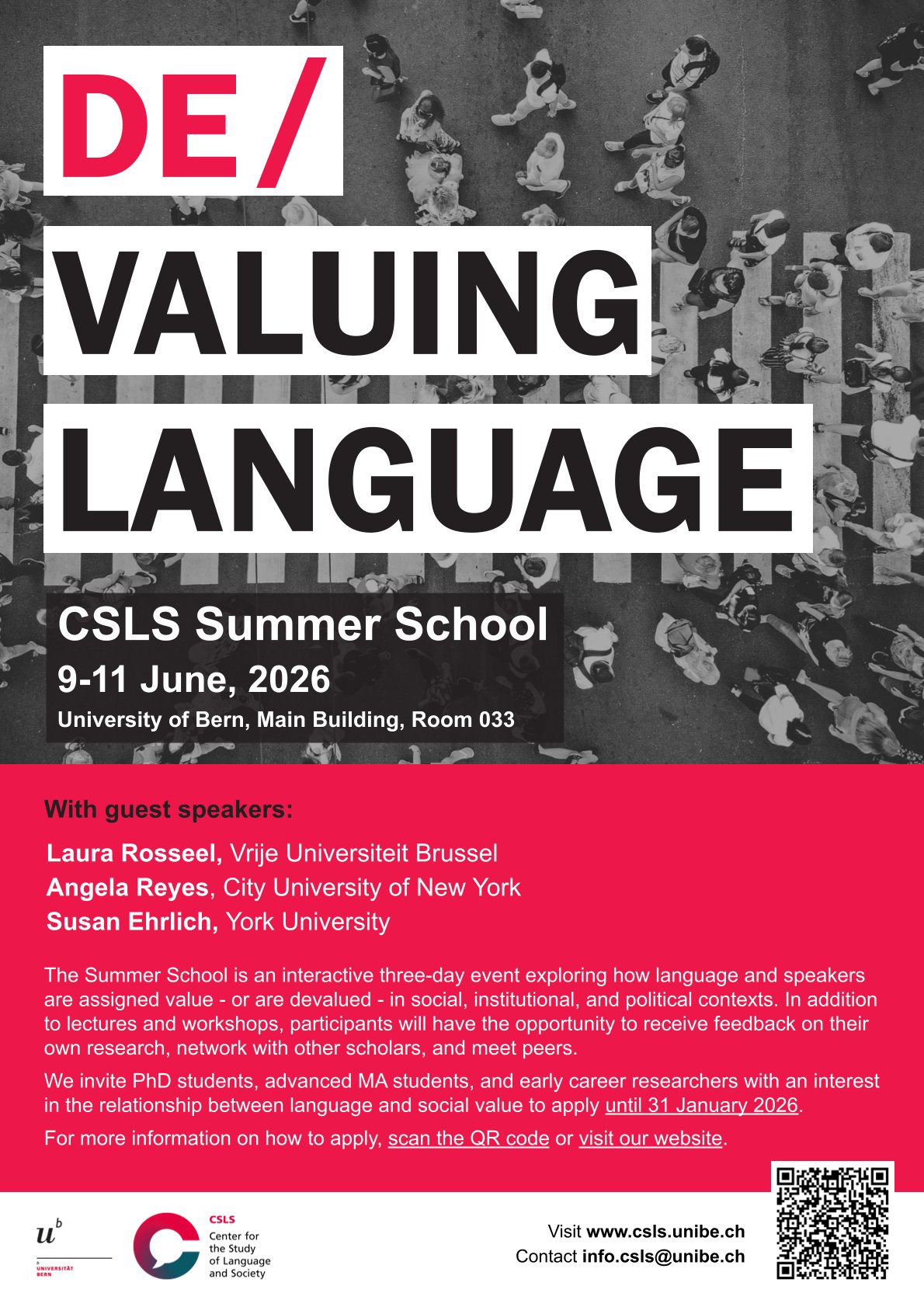 The Center for the Study of Language and Society (CSLS) at the University of Bern is dedicated to research and advocacy on the intersection between language and society. We conceive of this intersection in its widest sense. As a result, our work focuses on exploring how social changes affect languages and language use, how social beliefs and ideologies are reproduced and transmitted through language, and how, conversely, beliefs about language and language users have lasting social impacts. In particular, we aim to foster studies of the relationship between language, inequality and social (in)justice in all of its forms. We support and enable research and training on these topics at the postgraduate and postdoctoral levels, and work to promote the importance of language and language issues to a broad public, both within and outside of academia.