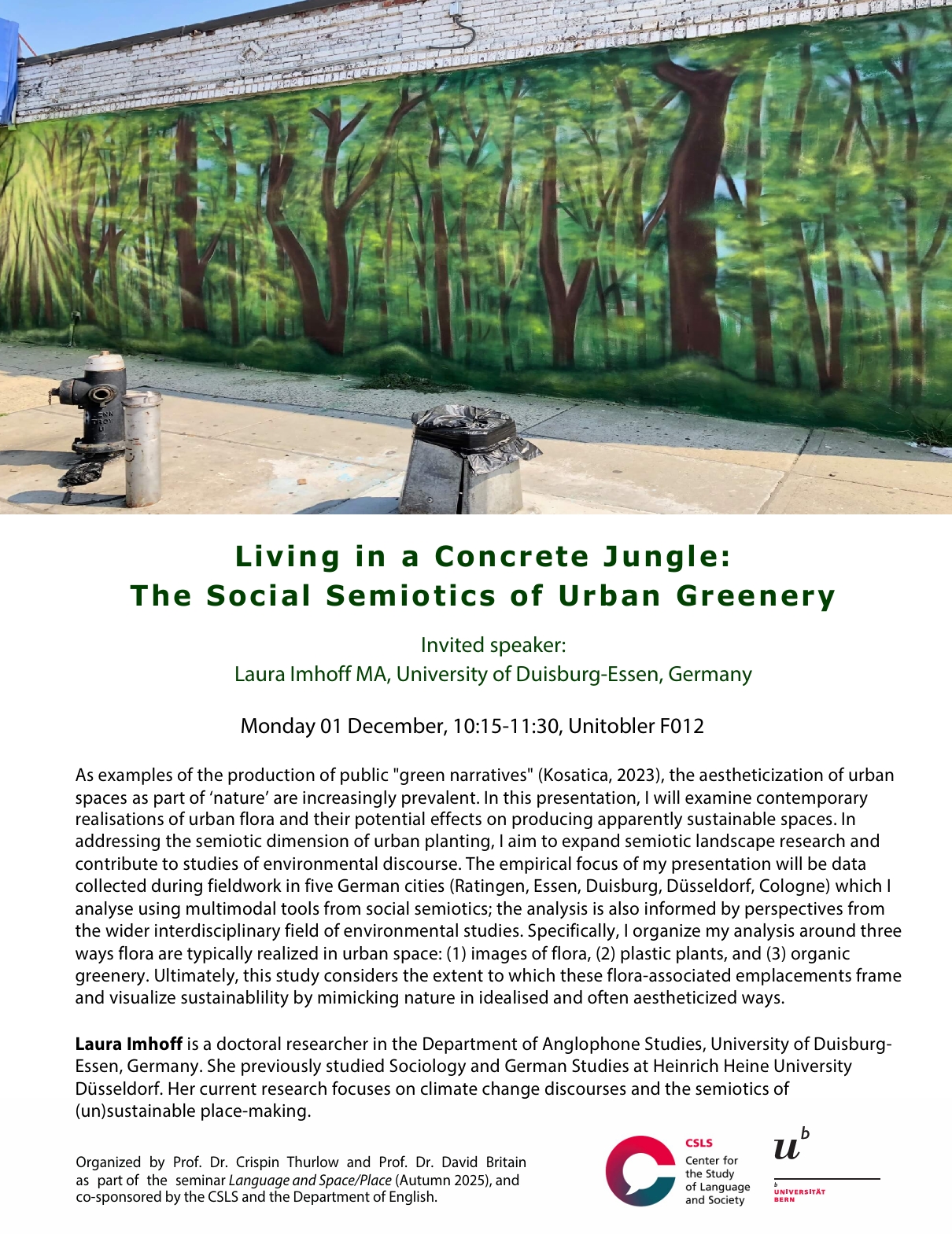 The Center for the Study of Language and Society (CSLS) at the University of Bern is dedicated to research and advocacy on the intersection between language and society. We conceive of this intersection in its widest sense. As a result, our work focuses on exploring how social changes affect languages and language use, how social beliefs and ideologies are reproduced and transmitted through language, and how, conversely, beliefs about language and language users have lasting social impacts. In particular, we aim to foster studies of the relationship between language, inequality and social (in)justice in all of its forms. We support and enable research and training on these topics at the postgraduate and postdoctoral levels, and work to promote the importance of language and language issues to a broad public, both within and outside of academia.