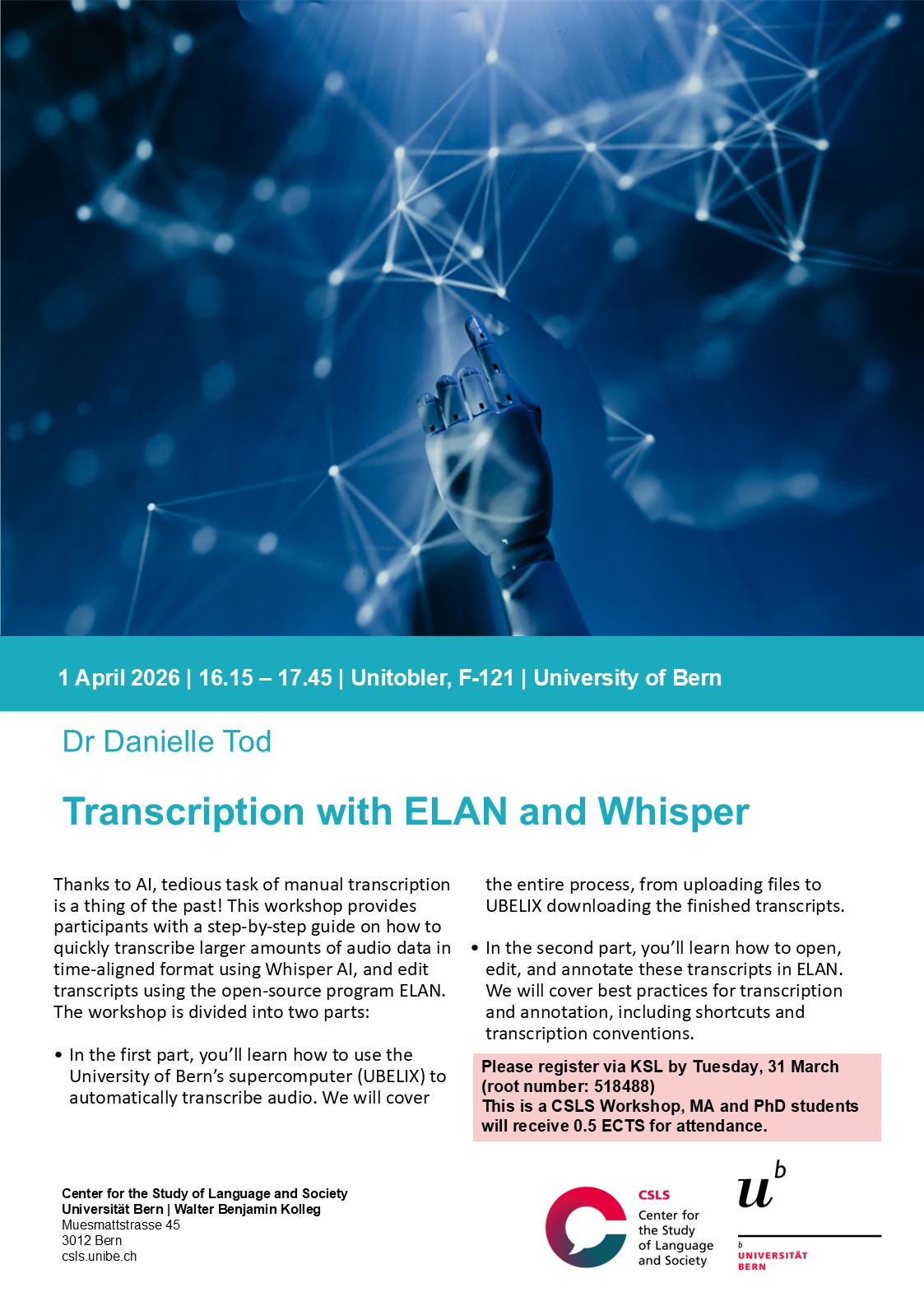 Le Center for the Study of Language and Society (CSLS) de l’Université de Berne se consacre à la recherche et au dialogue sur l’intersection entre langue et société. Nous comprenons cette intersection dans son sens le plus large. Par conséquent, notre travail porte sur la manière dont les changements sociaux agissent sur les langues et leur(s) usage(s), sur la manière dont les représentations sociétales et les idéologies sont reproduites et transmises à travers la langue et, inversement, sur la manière dont les attitudes envers la langue et ses utilisateur∙trice∙s ont des effets sociaux durables. En particulier, nous encourageons des enquêtes sur la relation entre la langue, l’inégalité et l’(in)justice sociale dans toutes ses formes. Nous facilitons la recherche et la formation sur ces sujets à partir du second cycle universitaire et au niveau doctorat et post-doctorat. Nous nous efforçons également de transmettre l’importance de la langue et des questions linguistiques à un large public, tant dans le milieu universitaire qu'au-delà.
