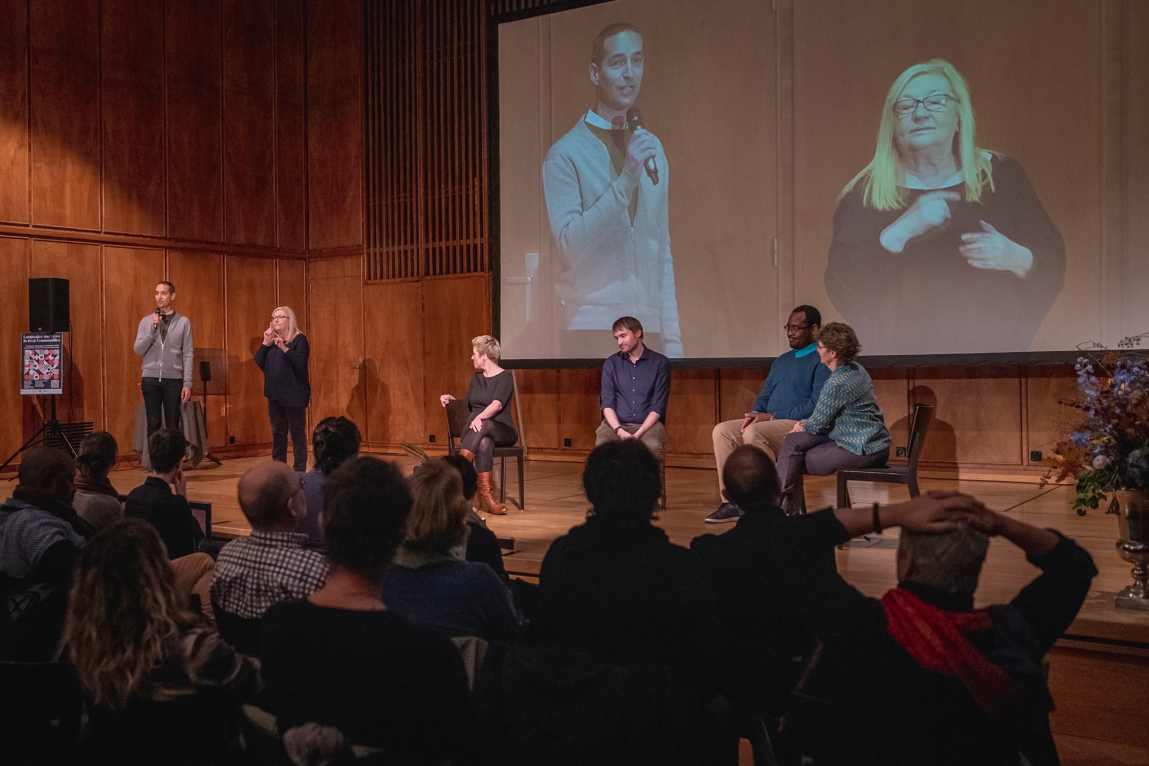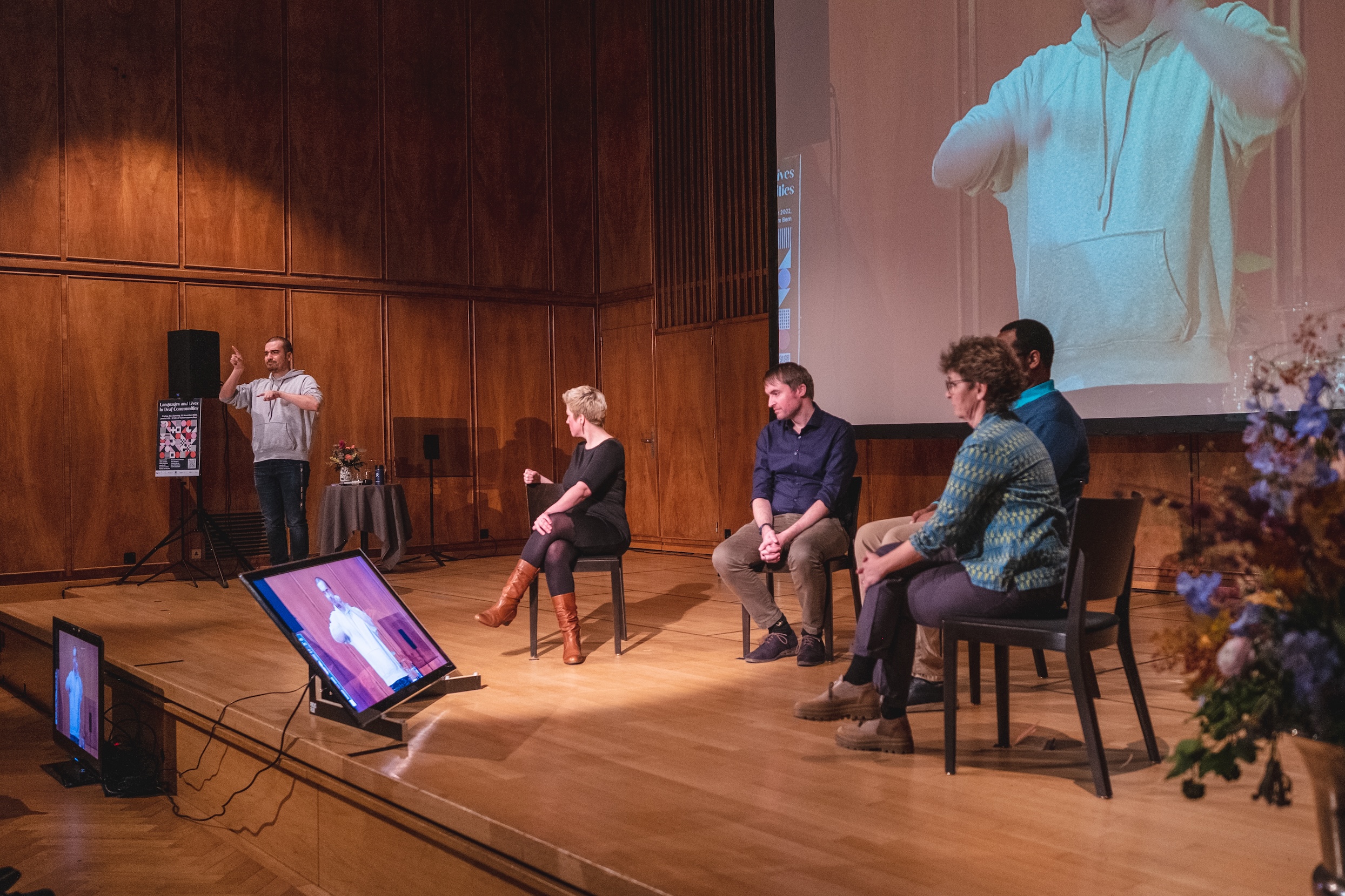 En novembre 2022, le CSLS, en collaboration avec la Fédération suisse des sourds, a organisé un événement public intitulé Languages and Lives in Deaf Communities au Konsi Bern. Pendant deux jours, l'événement a offert aux étudiant·e·s, aux chercheur⸱e⸱s et à un public plus large une introduction aux divers domaines aux études sociolinguistiques sur les langues de signes et les communautés sourdes et les malentendantes. Composé de 11 conférences publiques, toutes données par des scientifiques sourd⸱e⸱s, ainsi que plusieurs tables-rondes ouvertes, l'événement a abordé un large éventail de sujets de recherche actuels sur les questions linguistiques dans les communautés sourdes à travers le monde, et s'est penché sur la situation spécifique des communautés sourdes en Suisse. L'événement s'est déroulé en plusieurs langues, dont la langue des signes américaine (ASL), la langue des signes internationale (IS), la langue des signes suisse alémanique (DSGS) et l'anglais parlé.